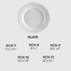 RCN-7 Round Plate, 7 1⁄2" $27.50, RCN-8 Round Plate, 9" $46.00, RCN-9 Round Plate, 9 3⁄4" $54.00, RCN-16 Round Plate, 10 1⁄2" $80.00, RCN-21 Round Plate, 12" $129.00, RCN-14 Oval Platter, 13" x 7 5⁄8" $152.00, RCN-4 Bouillon, 7.25 oz, 4" $27.00, RCN-24 Nappie Bowl, 10 oz, 5 1⁄4" $33.50, RCN-36 AD Saucer, 4 1⁄2" $18.00, RCN-2 Saucer, 6" $18.00, RCN-35 Demitasse Cup, 3.5 oz, 2 1⁄2" $24.00
