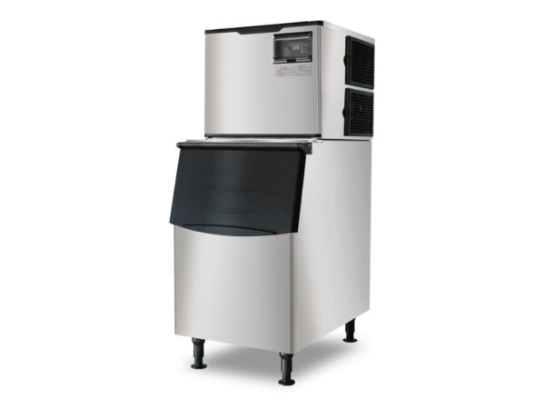 Blue LED lights illuminate the ice bin for clear visibility and monitoring.